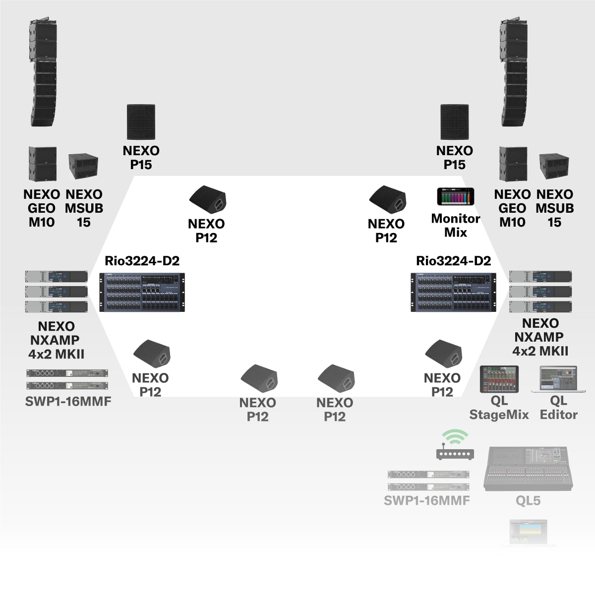 Featuring the industry standard Dante audio network, this system allows hundreds of channels to be routed over a single Ethernet cable, making system set up and configuration significantly easier, while also supporting redundant connections to ensure reliability. The CL/QL series digital mixers are mainstays in the industry, renowned for their sound quality, powerful functionality, and flexibility, making them suitable even for larger events despite their diminutive size. Combined with compact, high-output NEXO GEO M12 loudspeakers, this system can reliably deliver high performance concert sound, requiring only a small number of people to operate, set up, and transport to the next venue.