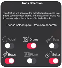 The latest version of Rec'n'Share (iOS 3.3/Android 3.4) features advanced AI algorithms for audio track separation. In addition to vocal, drum and bass detection, the software can now separate brass, piano and guitar tracks from a mixed audio track. This new feature expands the range of possible applications by allowing up to 3 tracks to be extracted for individual volume adjustment for recording or practice.