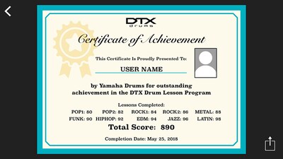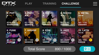 "El "Challenge Mode" es una nueva función del DTX402 Touch que pone a prueba tu habilidad. Si puedes tocar las 10 canciones de práctica sin cometer ningún error, recibirás un "Certificado de baterista" del equipo de batería DTX de Yamaha que podrás compartir a través de redes sociales.