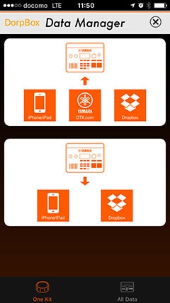 “Data Manager” permite descargar e instalar nuevos kits de usuario directamente desde YAMAHADTX.com. Adicionalmente, Data Manager permite hacer copias de seguridad del kit DTX700 en tu dispositivo iOS.