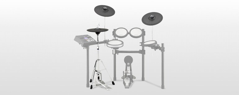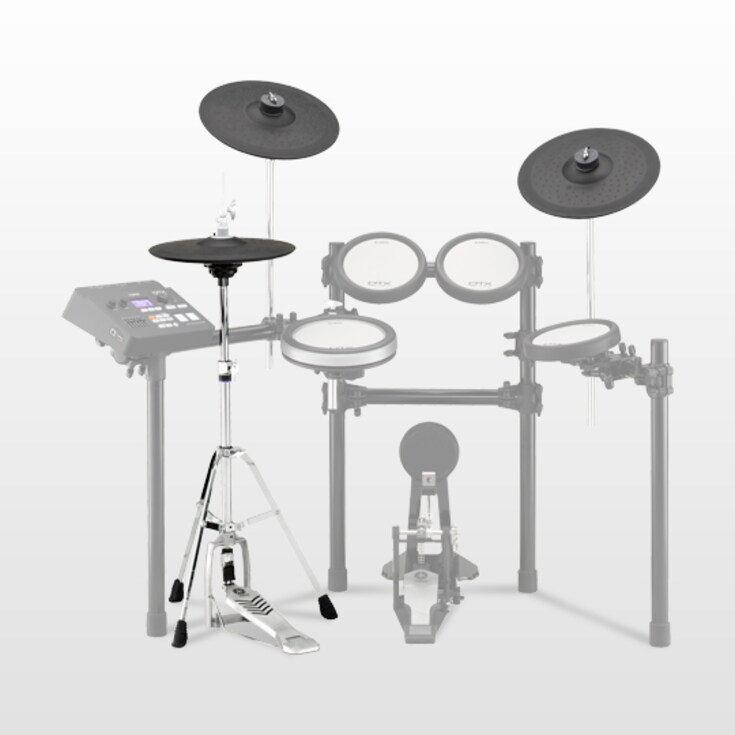 An electronic cymbal pad set to reload your DTXdrums that includes a crash cymbal pad, a ride cymbal pad and a hi-hat Pad with a stand.