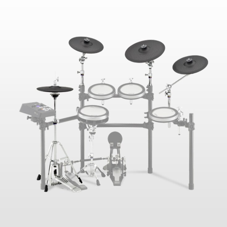 An electronic cymbal pad set to reload your DTXdrums that includes 2 crash cymbal pads, a ride cymbal pad with those holders and a hi-hat Pad with a stand.