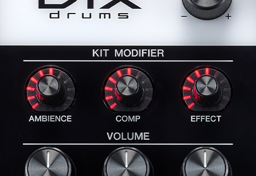 - The AMBIENCE, COMP, and EFFECT KIT MODIFIER knobs allow drummers to create their own unique sounds