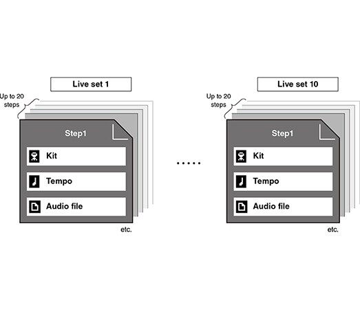 The new "Live Set" function allows you to freely arrange and configure various combinations of kits, tempos, and audio files and backing tracks, and recall them with a single touch. You can also create various click setups to accommodate different playing needs.