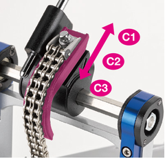 Esta duradera y fiable doble cadena potencia la fluidez del movimiento. La pieza al final de la cadena puede ser colocada en 3 posiciones, permitiendo al batería ajustar la acción del pedal dependiendo de su preferencias. Puede también ser utilizada con una correa, remplazando la cadena que viene con el pedal.