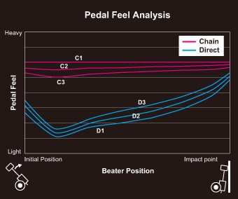 La tracción directa crea un enlace directo entre la plataforma y la maza, convirtiendo el movimiento del pie del batería a la maza instantáneamente. El enlace de la tracción directa se puede colocar en 3 posiciones distintas, permitiendo al batería ajustar la acción del pedal en función de sus preferencias.