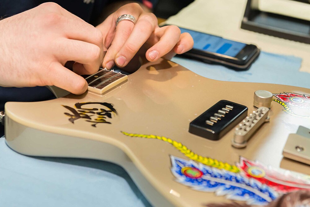 “The guitar was an unfinished white wood body and neck that I routed for our specifications in terms of bridge, tuners, pickups, et cetera,” said Campolattano. “The custom features include custom champagne gold metallic nitro finish, hand carved scalloped-bone nut, Kluson tuners with tullip buttons, thorn staple top GT90 bridge pickup and Jescar stainless steel Frets!”