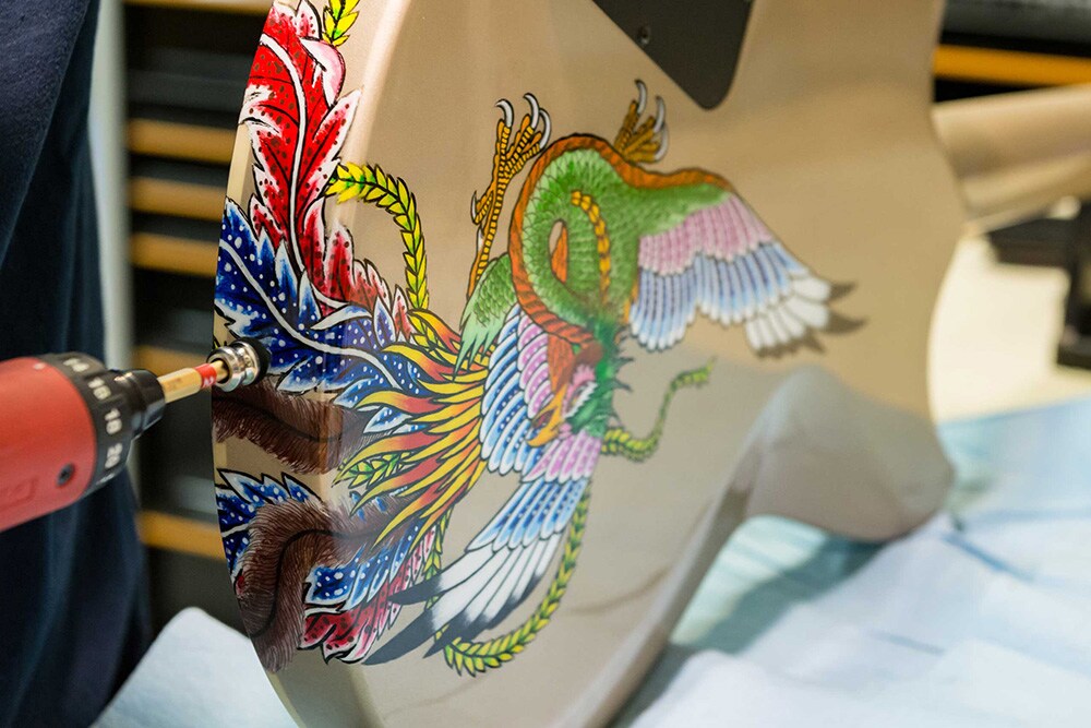 “I came up with some ideas involving tigers and Japanese evil masks, but in the end I chose to use a dragon and a phoenix,” said Hiro. “The Yamaha logo reminds me of a phoenix, which is a perfect theme for my new relationship with the company, and incorporates our shared Japanese heritage.”