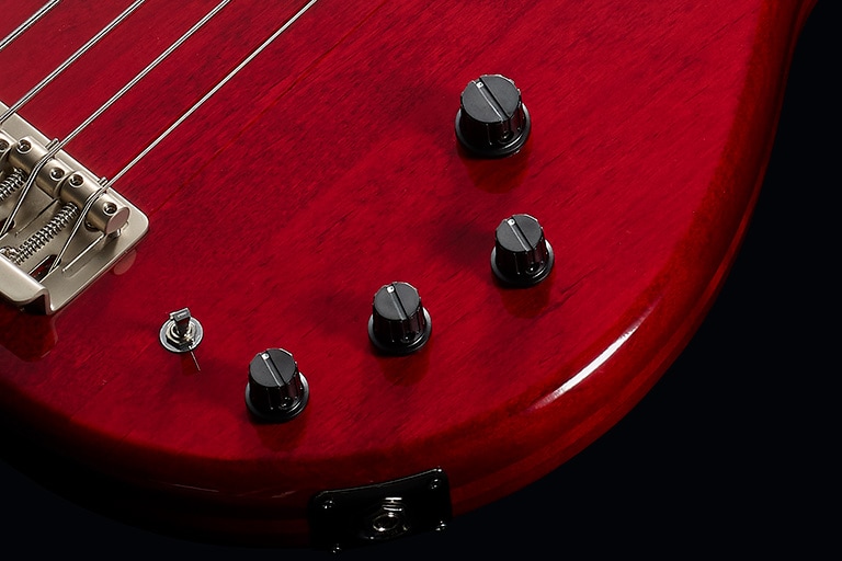Los controles incluyen conmutador activo/pasivo, volumen y ecualización de 3 bandas. El control de agudos tiene la doble función de actuar como tono general en modo pasivo.