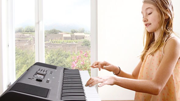 "Los teclados como el PSR-E363 y el PSR-EW300 tienen teclas sensibles a la pulsación. Al tocar con más fuerza el sonido suena con más volumen, mientras que tocando suavemente se produce un sonido delicado. Esto permite un nuevo mundo de expresividad y emoción musical. Y lo que es más, tu hijo estará perfectamente preparado para entrar en una escuela de música, ya que allí usan teclados sensibles a la pulsación.