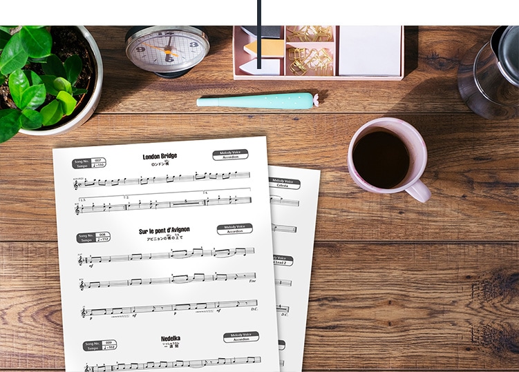 Sheet music for the onboard Songs are available for free as a Song Book. Use this together with the lesson functions to master standards that are popular around the world, and learn how to play with chords quickly even if you don’t have any experience playing the keyboard.