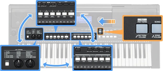 La función PATTERN coloca una enorme cantidad de potentes loops y ritmos a tu alcance para crear instantáneamente música con gran variedad dinámica sobre la marcha, como un DJ, y manipular los Potenciómetros de Control a tiempo real para obtener aún más variedad sonora.