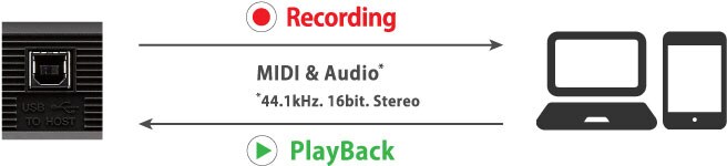 El terminal USB-TO-HOST te permite conectar el instrumento a un ordenador o dispositivo portátil y grabar audio de alta calidad sin la necesidad de un interfaz adicional. Además, hay disponible una amplia variedad de creativas Apps iOS desde la App Store*.