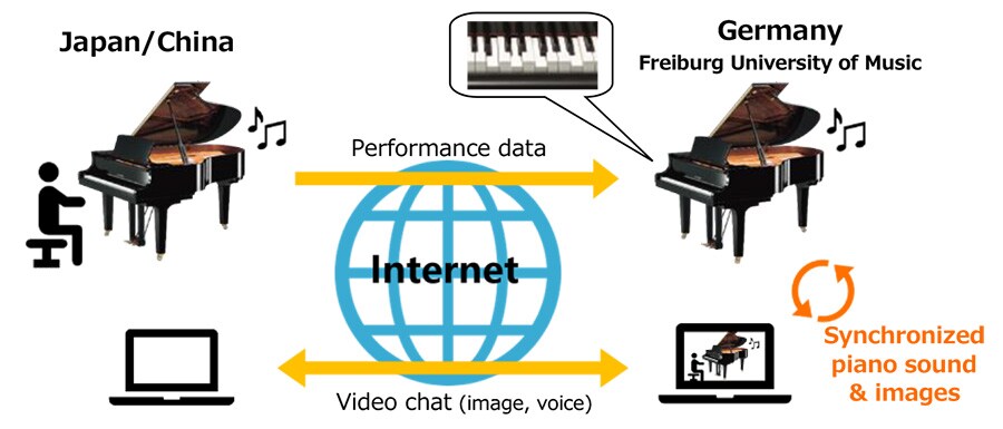 Utilizando piano Disklavier y su función de ejecución en remoto, un piano que se toca en Alemania puede sonar en directo en otro piano sincronizado en Japón o China.