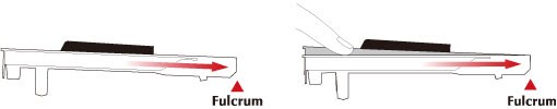 Las teclas del Clavinova están construidas de modo que los pivotes en el interior del instrumento que las soportan estén tan lejos del borde de las teclas como sea posible. Mejorando la capacidad de interpretación y la comodidad, incluso en la base de las teclas. Este sistema proporciona un buen recorrido de la tecla. En las piezas en las que se utilizan muchas teclas negras, las blancas se hunden suavemente aun cuando se toquen cerca de su base, conservando los delicados matices que se alcanzan con las distintas intensidades de la interpretación.