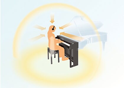 Solo hay que seleccionar la voz de piano de cola Yamaha CFX y ponerse los auriculares y ya tenemos el sonido muestreado binaural, no hace falta ningún ajuste adicional. Ahora, con o sin auriculares, se puede disfrutar plenamente de la sensación de tener un piano de cola en casa.