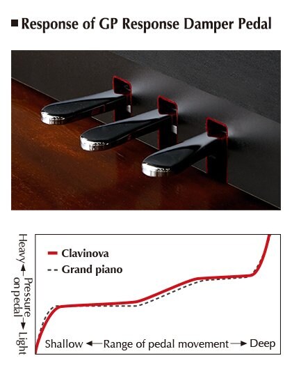 Los modelos altos de gama traen el pedal de resonancia GP Response, que ofrece la curva de resistencia típica de los pianos de cola, empezando con poca resistencia y aumentándola a medida que se pisa más hacia abajo el pedal. De esta manera, los pianistas se acostumbran a los delicados matices que se consiguen con el uso del pedal.