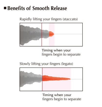 Clavinova puede ofrecer ese sonido afilado que se escucha cuando se toca staccato, al igual que el sonido lento y prolongado que se produce cuando se liberan las teclas más lentamente. Esto proporciona una detallada respuesta que reproduce cada matiz de la interpretación.