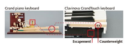 Los contrapesos se introducen en cada Tecla de un piano de cola para balancear el peso de los macillos y ofrecer un control más preciso cuando tocamos suavemente, a bajo volume. El Clavinova incorpora contrapesos cuidadosamente ajustados para mejorar el control a la hora de tocar pianissimo, y un retorno más preciso cuando tocas pasajes rápidos..