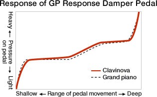 El pedal de resonancia es un elemento importante al tocar el piano, ya que cambia el sonido de manera continua mientras se pisa. El Clavinova proporciona un comportamiento de piano acústico detectando constantemente la cantidad de recorrido del pedal y ajustando con exactitud la cantidad de reverberación y alargue de las notas. Además, el Pedal de Resonancia con Respuesta GP reproduce la sensación propia de los pedales de pianos de cola, ofreciendo menos resistencia cuando se comienza a pisar y notándose más pesado cuando empieza a hacer efecto. Como resultado, el intérprete consigue un mayor control cuando utiliza el pedal de resonancia.