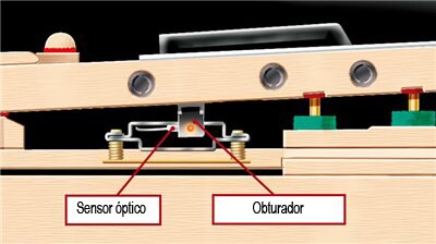 Bajo cada una de las 88 teclas se sitúa un sistema de detección óptica exclusivo de Yamaha. El sistema se compone de un emisor de luz y un receptor fijos en la cama del teclado, con una fina y ligera lámina graduada en escala de grises (más oscura en un extremo y transparente en el opuesto) que pasa entre ambos, fijada a la tecla. Al moverse la tecla, la cantidad de luz que permite pasar la lámina varía, y midiendo la cantidad de luz que pasa podemos saber la posición de la tecla en todo momento. Todo ello, sin añadir ningún rozamiento ni paso adicional a la maquinaria del piano.