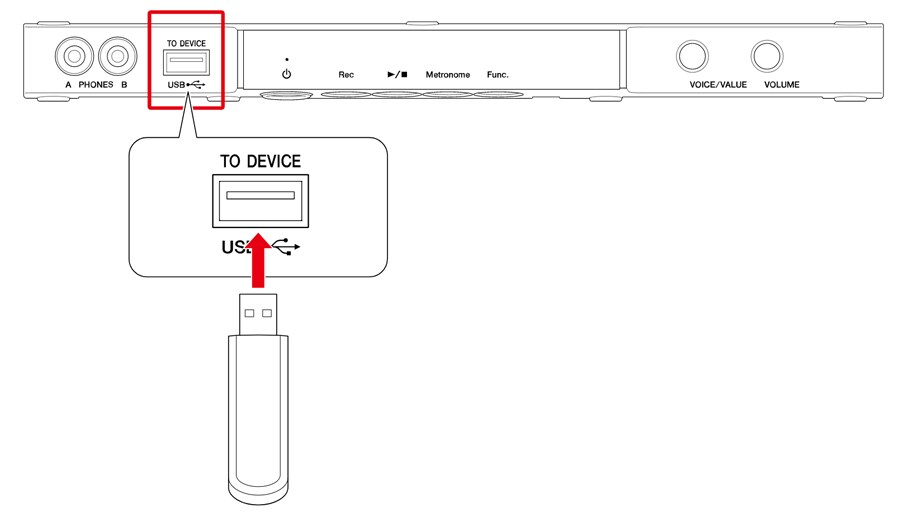 El conector USB TO HOST permite conectar el sistema a un ordenador, móvil o tablet para grabar directamente audio de alta calidad sin necesidad de equipos adicionales. El conector AUX IN permite llevar el sonido de otros dispositivos como reproductores al módulo para mezclarlo con el sonido tu interpretación.