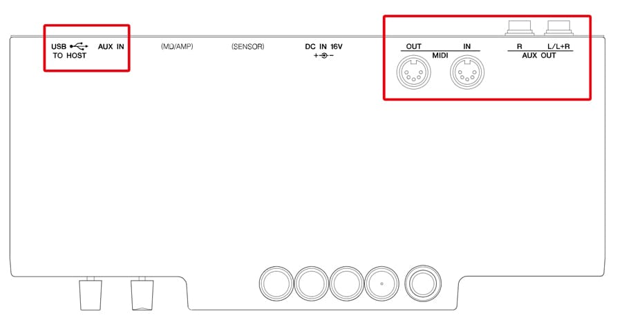 El conector USB TO HOST permite conectar el sistema a un ordenador, móvil o tablet para grabar directamente audio de alta calidad sin necesidad de equipos adicionales. Podrás utilizar la salida AUX OUT para conectar a multitud de equipos externos (por ejemplo: amplificadores estéreo, unidades de efectos, grabadores externos, altavoces autoamplificados, etc.) mientras que el conector AUX IN permite llevar el sonido de otros dispositivos como reproductores al módulo para mezclarlo con el sonido tu interpretación. Gracias a la conexión MIDI de entrada y salida del TransAcoustic™ TA2 podrás llevar la información de tu interpretación a sintetizadores o secuenciadores, donde podrás editarla y mandarla de nuevo al módulo para disfrutar de su exclusivo sonido.
