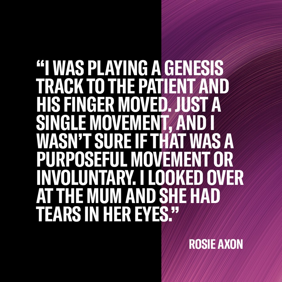 Rosie continues: “I was playing a Genesis track to the patient and his finger moved. Just a single movement, and I wasn’t sure if that was a purposeful movement or involuntary. I looked over at the mum and she had tears in her eyes. I carried on playing the track and didn’t think much of it and I saw his finger move again. As the session continued, I didn’t see any more responses, so I asked mum afterwards, ‘Are you OK?’ and she said, ‘I can’t believe it! He’s never done that before.’”