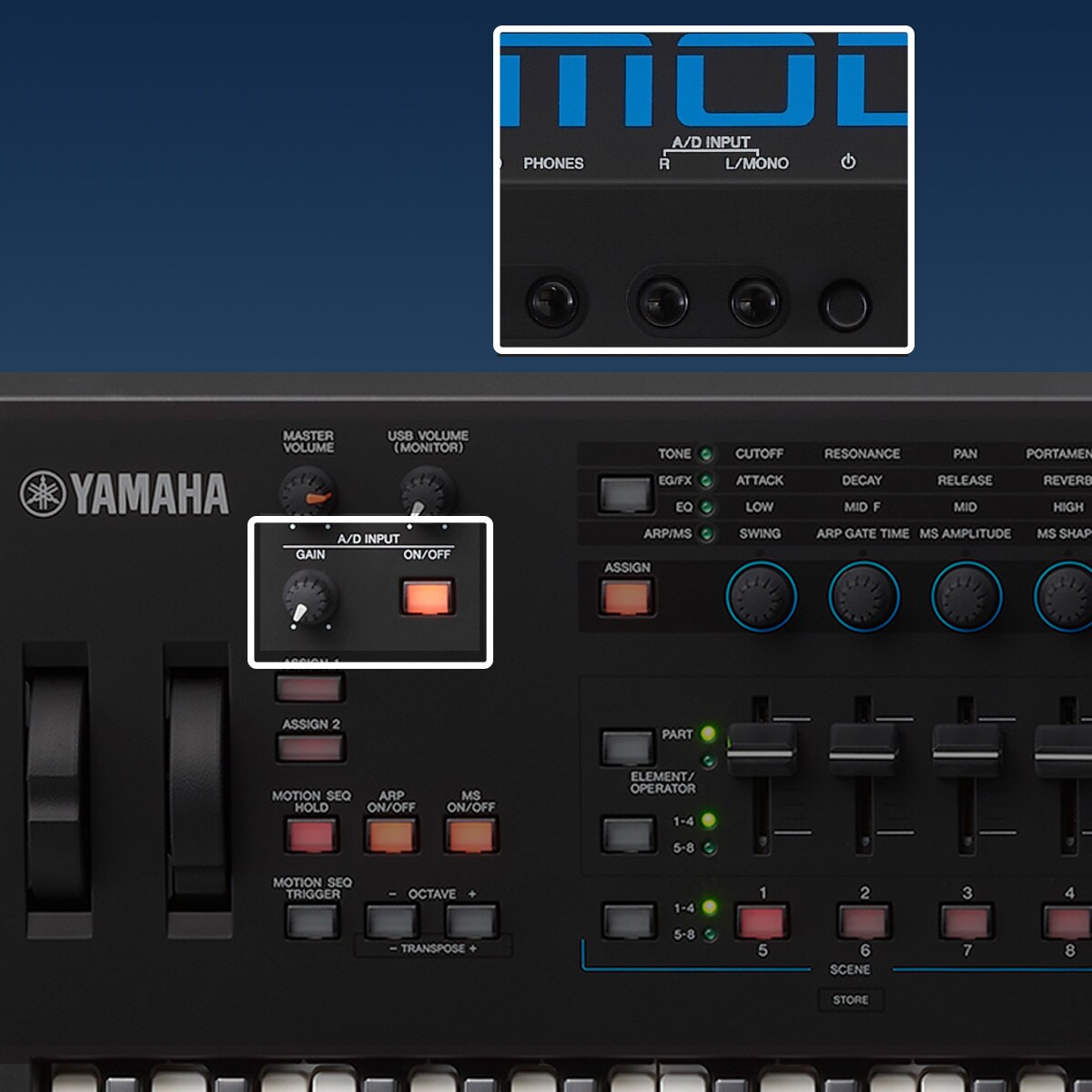 Una entrada estéreo A/D te permite conectar diferentes fuentes externas como sintetizadores analógicos, voces u otros instrumentos dentro del Motion Control del MODX+. Esto implica que el control del MODX+ va más allá del simple procesamiento de efectos onboard. Controla parámetros individuales con sus controles físicos o deja que MODX+ te ayuda con “manos invisibles” gracias a Motion Control. Añade vocoder, Envelope Follower y Audio Beat Sync y es como si la entrada A/D fuera un instrumento en sí misma.