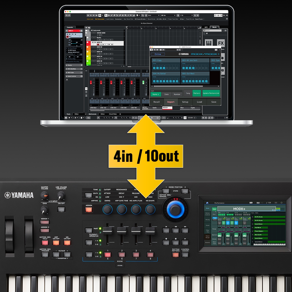 Tal y como se espera de la producción musical moderna, basada en ordenadores, MODX+ incorpora un interface profesional multicanal USB de audio, con 4-in/10-out. En acción con dos entradas A/D, MODX+ es la pieza central de cualquier estudio de grabación profesional o equipo avanzado de directo.