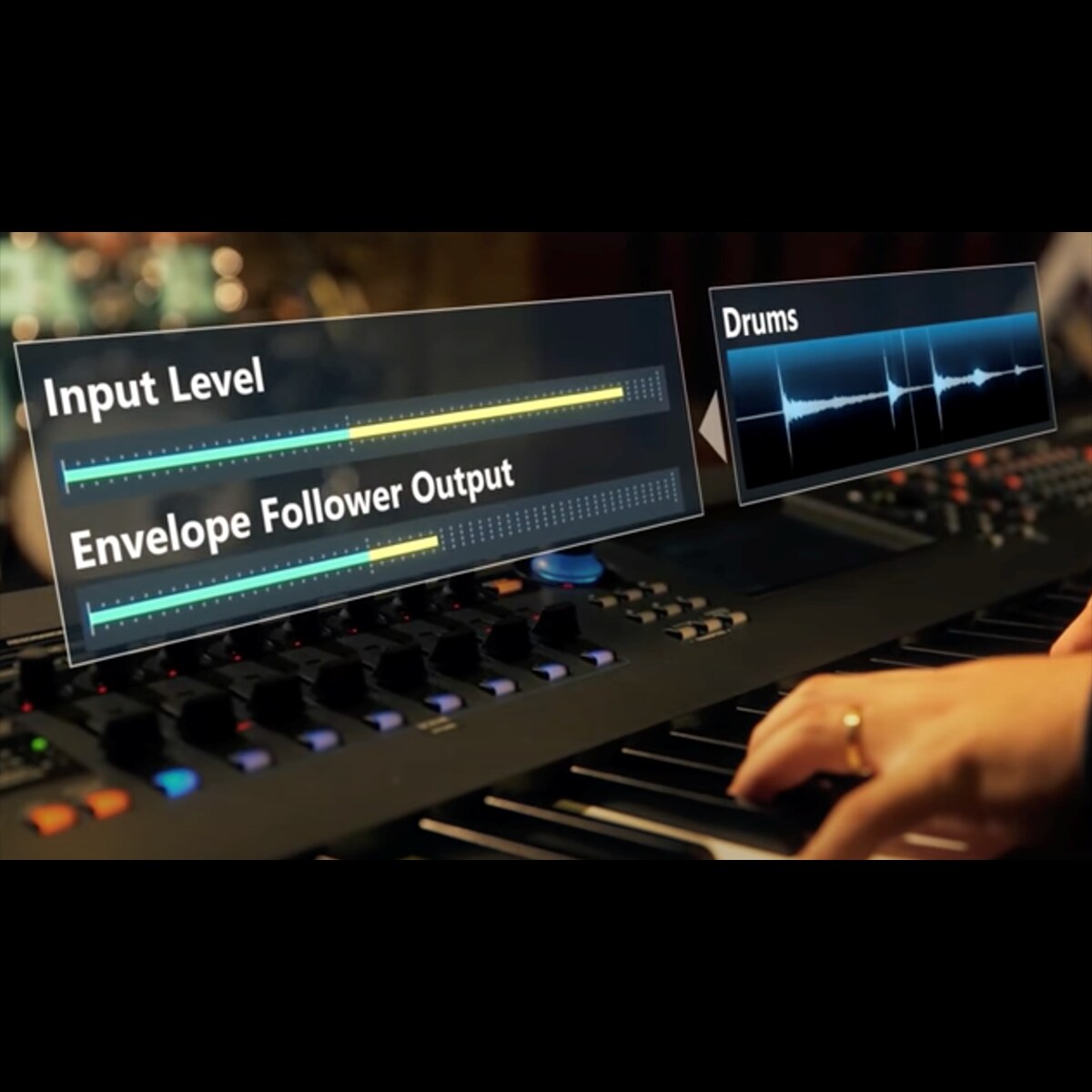 El Envelope Follower convierte el audio en una fuente de control para controlar virtualmente cualquier parámetro del sintetizador. Por ejemplo, un loop de batería podría accionar parámetros de efectos para conseguir un ritmo alucinante, o una grabación vocal podría controlar múltiples parámetros para conseguir un sintetizador "que habla". El audio incluso puede ser una fuente "en directo" a través de la entrada A/D.