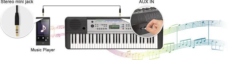 Conecte su reproductor de audio al YPT-255 y escuche, o toque junto a su música favorita con los altavoces del teclado.