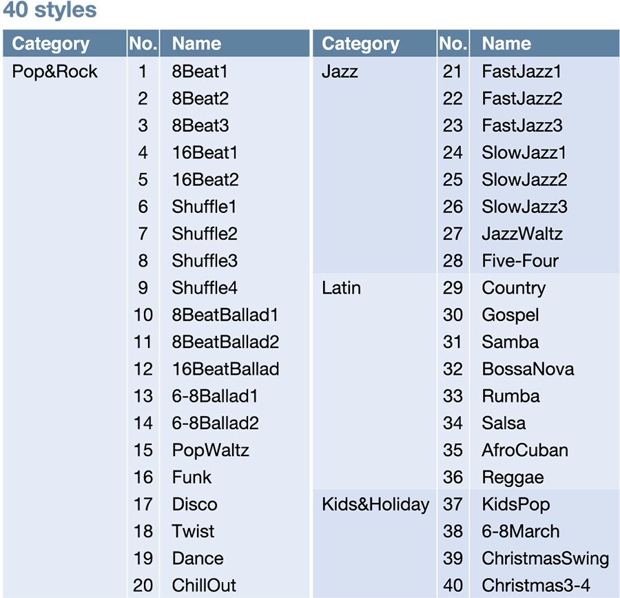 El P-515 viene con un completo abanico 40 patrones rítmicos (acompañamiento de bajo y batería), perfectos para prácticamente cualquier tipo de música, de manera que puedes condimentar tu actuación con músicos de acompañamiento, estudiar de manera más divertida, o abrir tu mente a nuevas e inspiradoras ideas.