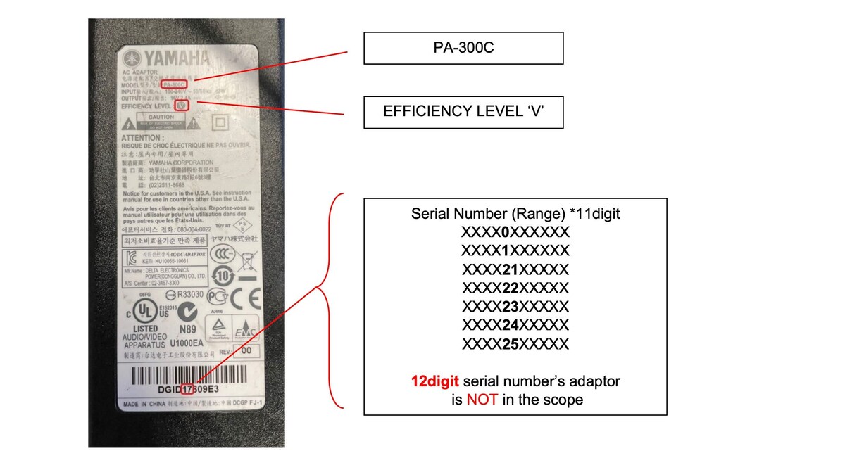 Solo se retira el adaptador de alimentación de CA PA-300C, que no se vendió por sí solo en tiendas, sino que se incluyó con ciertos instrumentos digitales y productos musicales que se enumeran a continuación. Además, el adaptador estaba integrado en algunos pianos digitales YAMAHA CLAVINOVA de las series CLP y CVP.